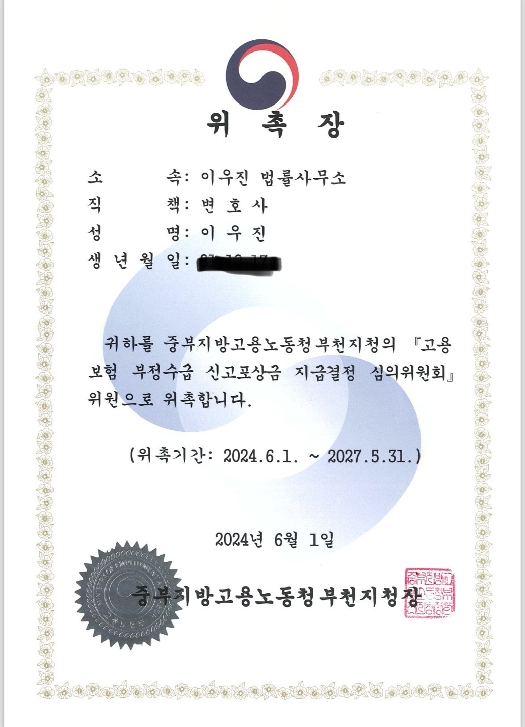 인천지방변호사회 소속 공익활동의 일환으로, 중부지방고용노동청 부천지청과 함께 심의회 활동을 하게 되었습니다.