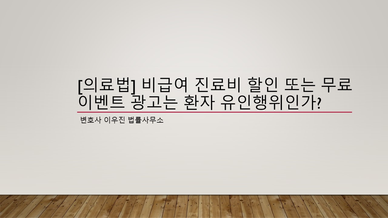 비급여 항목에 대한 할인이나 무료 이벤트가 모든 경우에 의료법 위반으로 간주되지는 않지만 의료시장의 공정한 경제질서를 해치는 경우에는 위법 행위로 판단될 수 있는데요, 이는 관련 법령 그리고 판례, 보건복지부의 유권해석 등을 종합 검토하여 적절한 해석에 이르러야할 것입니다.