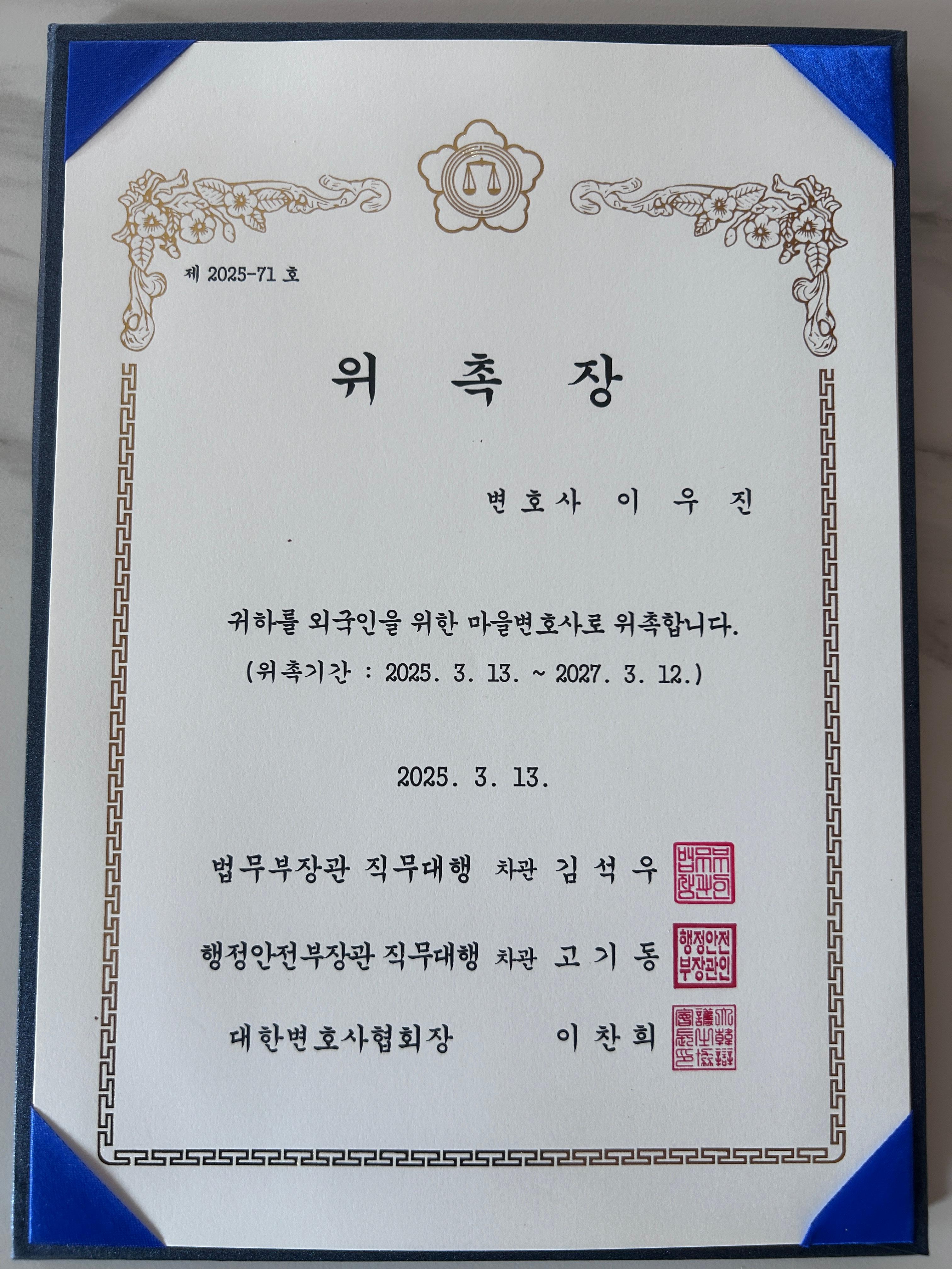 이우진 변호사는 법무부가 운영하는 ‘외국인을 위한 마을변호사 제도’의 일환으로, 외국인을 위한 마을변호사로 위촉되었습니다.