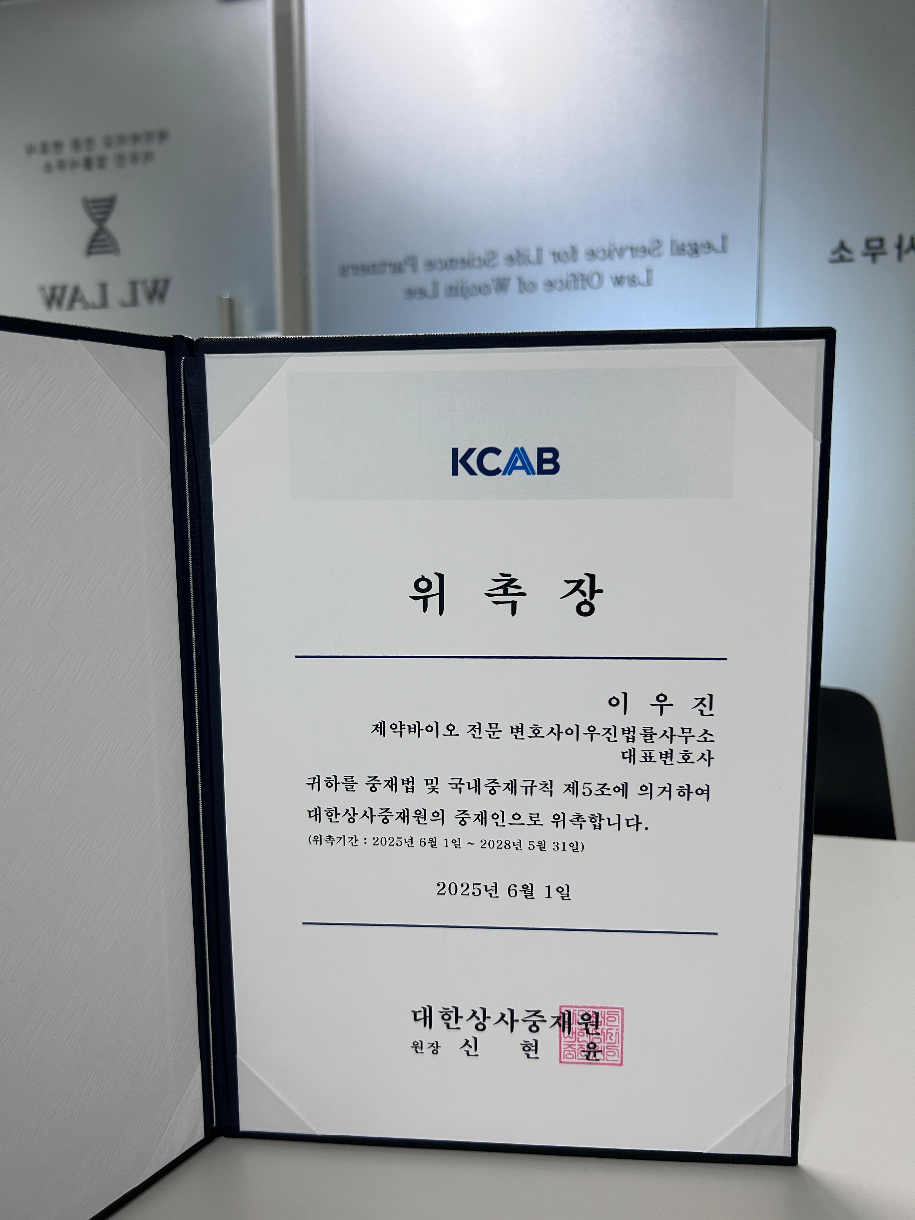 2025년 6월 1일부로, 대한상사중재원(KCAB)의 제약·바이오 분야 전문 중재인으로 위촉되었음을 알려드립니다.