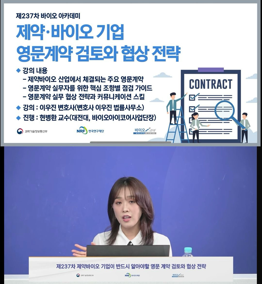 최근 현병환 교수님과 함께하는 바이오아카데미(바이오아이코어사업단)에서 제약·바이오 기업의 영문 계약 및 협상 전략을 주제로 강의를 진행하였습니다. 전반적인 체계와 검토 방법을 다루느라 더 깊은 이야기를 하지 못해 너무 아쉽지만, 영문 계약 실무를 담당하는 분들께 조금이라도 도움이 되었으면 합니다. 감사합니다.