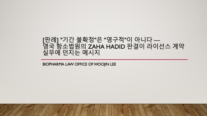 Zaha Hadid 항소법원 판결은 계약서 문언 하나가 수천만 파운드의 법적 결과를 초래할 수 있음을 보여주는 실증적 사례입니다. "영원히(forever)"와 "기간 불확정으로(indefinitely)"는 일상 언어에서 혼용되지만, 영국 계약법에서는 전혀 다른 법적 의미를 갖습니다. 제약·바이오 분야의 기술이전, 공동연구개발, 특허 라이선스 계약을 체결하거나 검토할 때, 해지 조항의 문언과 구조를 정밀하게 설계하는 것이 필수적입니다.
