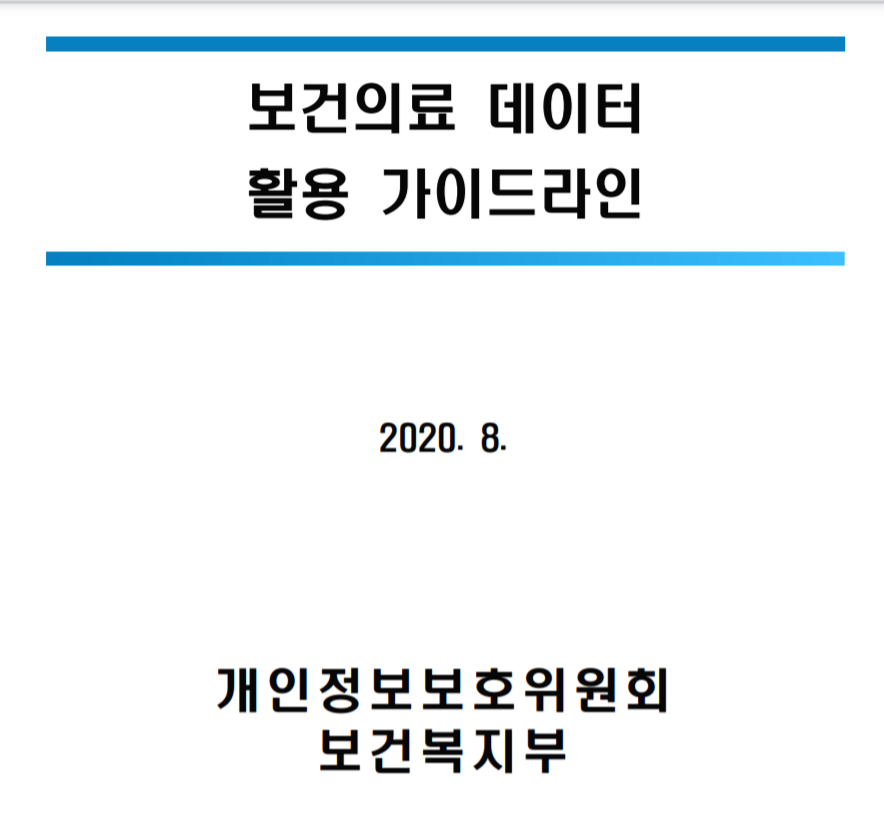 보건복지부와 개인정보보호위원회에서 보건의료데이터 활용 가이드라인(안)의 의견수렴을 위해 발행한 보건의료 데이터 활용 가이드라인과 2021년 발간된 보건의료 데이터 활용 가이드라인을 첨부드립니다.