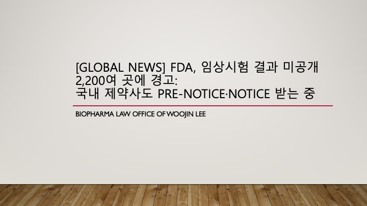 요지. 미국 FDA는 2026년 4월 13일 보도자료를 통하여, 3월 30일자로 임상시험 결과 제출 의무를 이행하지 아니한 것으로 보이는 2,200여 개 의료제품 기업·연구자에게 상기 서한(reminder letter)을 발송하였음을 공개하였습니다. FDA 분석 결과 대상 임상시험의 29.6%가 미준수 상태였으며, Martin Makary 국장은 결과 미공개를 "성공은 과대대표되고 실패는 과소대표되는" 구조적 문제로 규정하였습니다. 본고에서 FDA 웹사이트의 Pre-Notice 및 Notice of Noncompliance 공개 목록을 직접 검토한 결과, 이미 한국에 본사 또는 주된 사업 기반을 둔 기업 4곳이 해당 목록에 등재되어 있으며, 그중 1개사는 Notice of Noncompliance 단계까지 에스컬레이션된 상태인 것으로 확인되었습니다. 이는 추상적 경고가 아니라 현재화된 규제 리스크이며, IND 기반으로 미국 임상을 진행 중인 국내 제약·바이오 스폰서 전체에 대한 선제적 준수 점검이 요구됩니다.