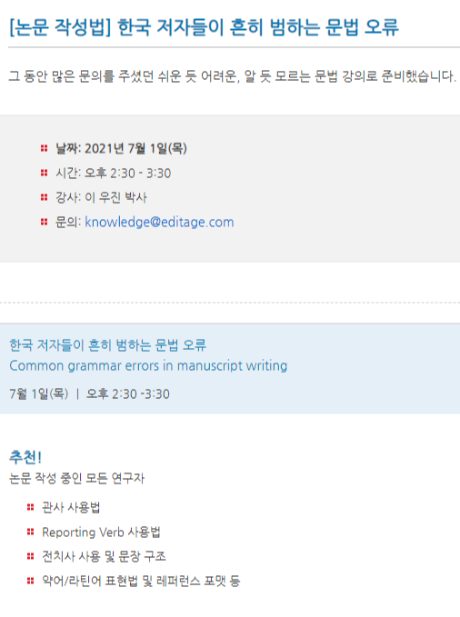 강의는 https://www.editage.co.kr/webinars/에서 신청하여 들으실 수 있습니다.