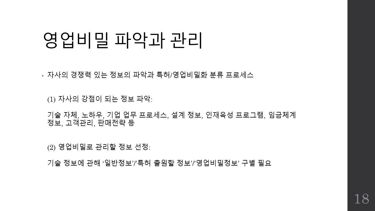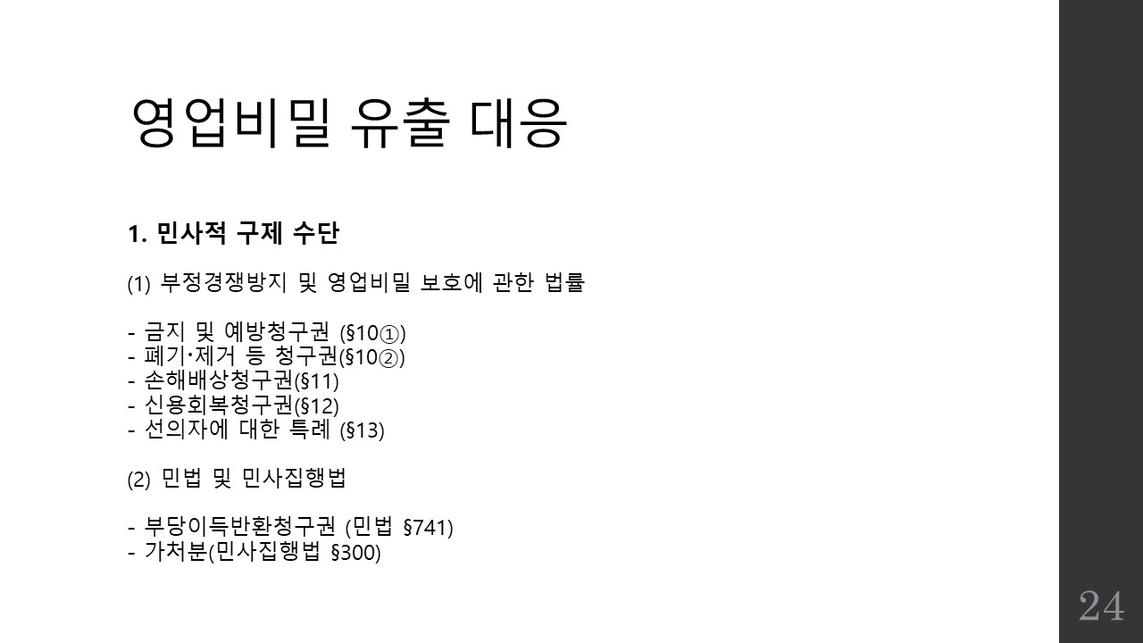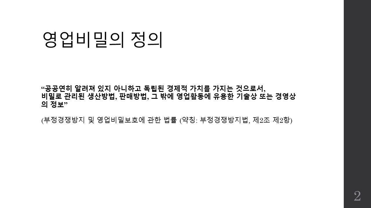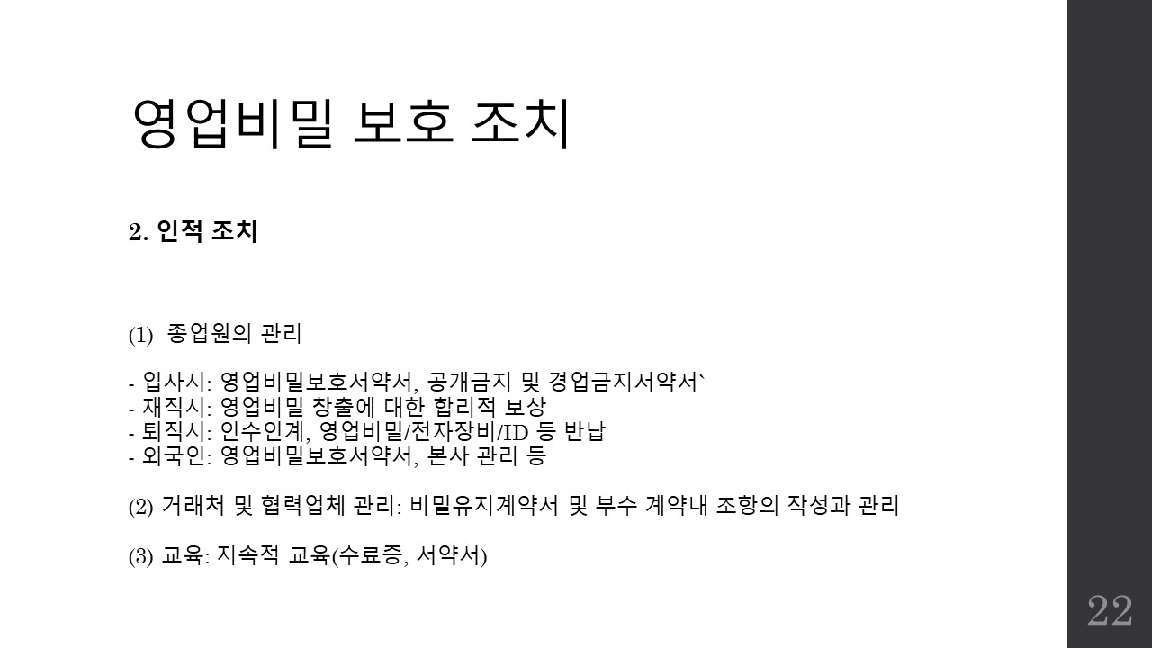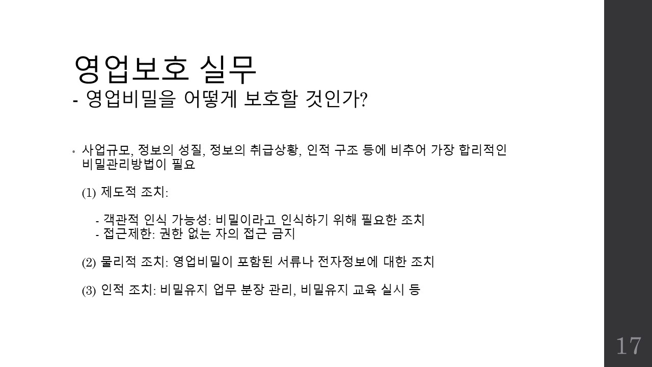 파워포인트 슬라이드로 영업비밀보호 제도의 개요와 관리방안, 그리고 침해시 구제책에 대한 간략한 소개자료를 만들어공유드리며 파일이 필요하신 분은 제 이메일로 요청해주시면 송부드리도록 하겠습니다.