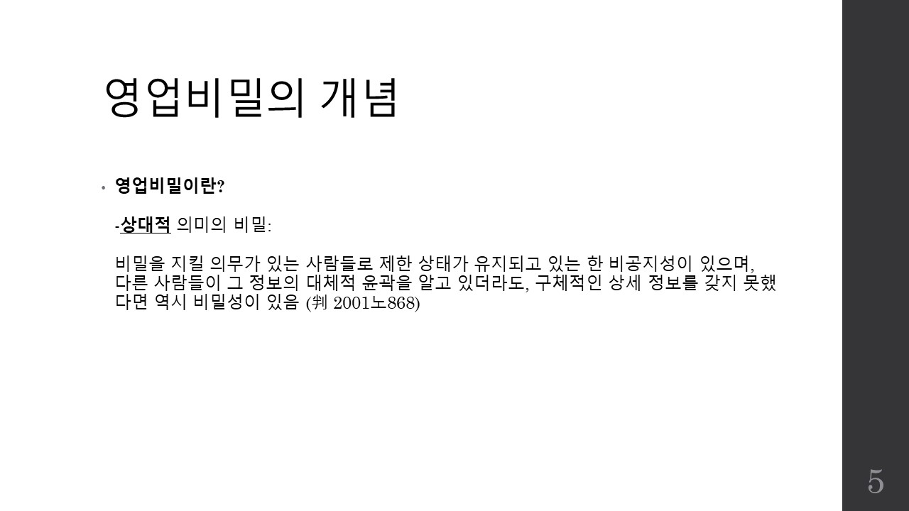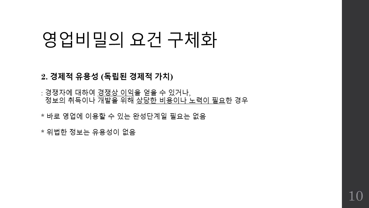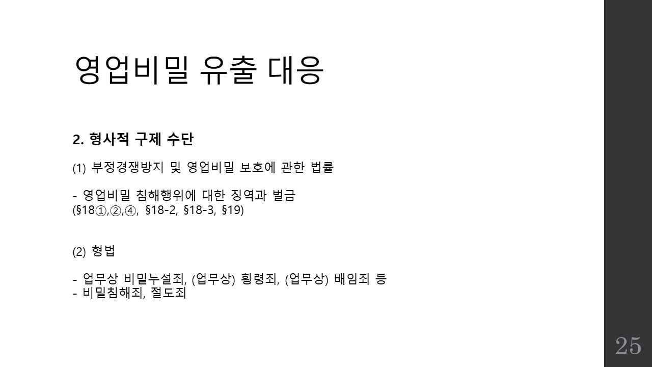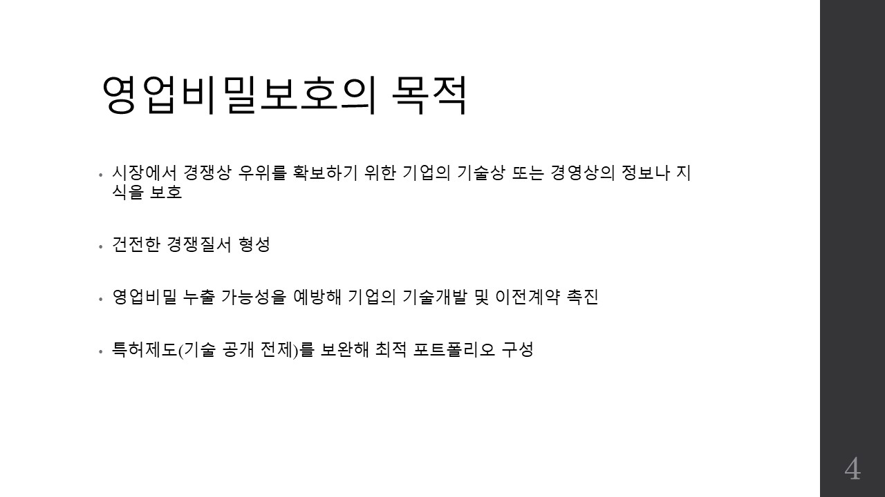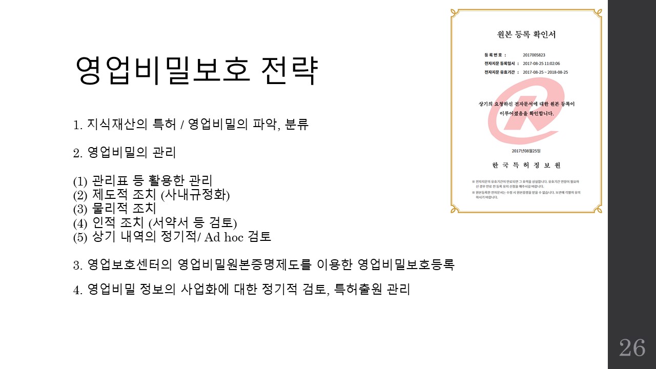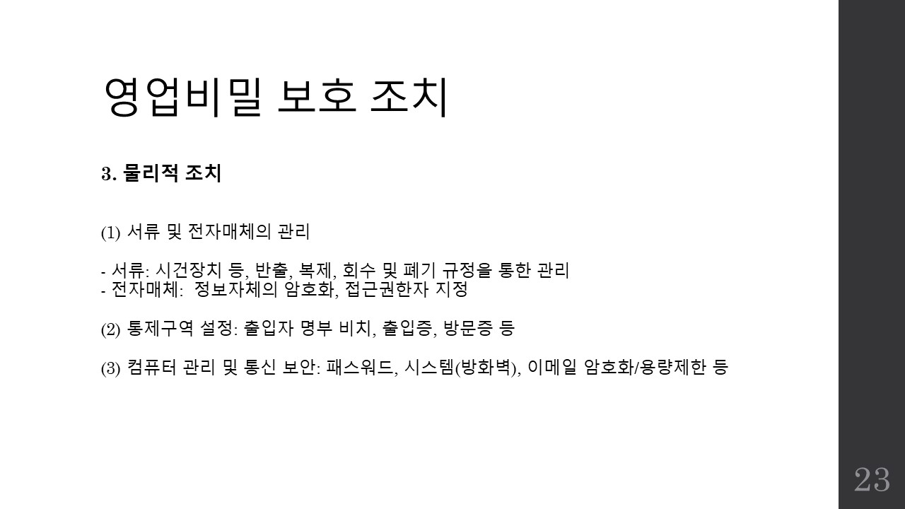 파워포인트 슬라이드로 영업비밀보호 제도의 개요와 관리방안, 그리고 침해시 구제책에 대한 간략한 소개자료를 만들어공유드리며 파일이 필요하신 분은 제 이메일로 요청해주시면 송부드리도록 하겠습니다.