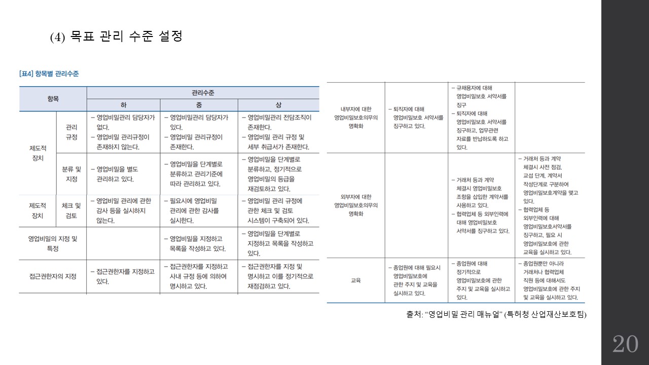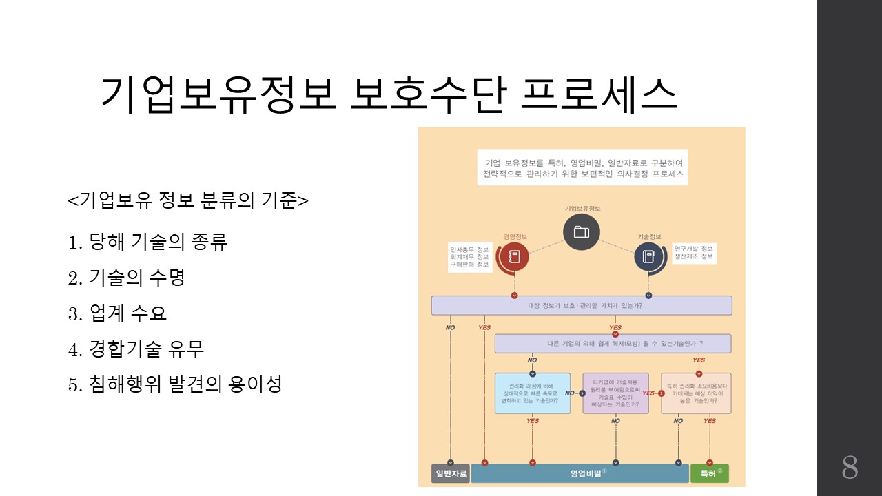자료는 영업비밀보호센터와 특허청 산업재산보호팀에서 제공하는 "영업비밀관리 매뉴얼", "영업비밀보호 실무편", 그리고 “기술보호의 초석 영업비밀 보호제도"을 참고하여 정리하였으므로 더 상세한 사항은 해당 자료집을 통해 확인하시면 좋겠습니다.