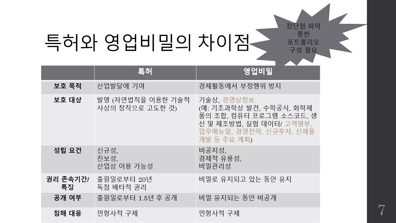 영업비밀은 해당 정보를 비밀로 관리할 것을 전제로 할 경우 영구히 보유자 자신만이 사용할 수 있는 장점은 있으나, 타인이 동일한 기술을 정당하게 취득 또는 개발하여 사용할 경우 이를 금지할 수 없으며, 타인이 특허권을 획득할 경우 영업비밀보유자는 영업비밀 사용에 있어서 제약을 받게 될 수도 있는 단점도 있습니다. 따라서 기술의 종류나, 계발단계, 수요, 지속가능성, 경제적 가치, 시장성, 비밀관리 가능성 등의 다양한 요인을 고려하였을 때 특허와 영업비밀 중 기업의 이익실현에 유리한 제도를 택하여 효율적이면서 경제적인 지식재산 포트폴리오를 구성하여야할 것입니다.