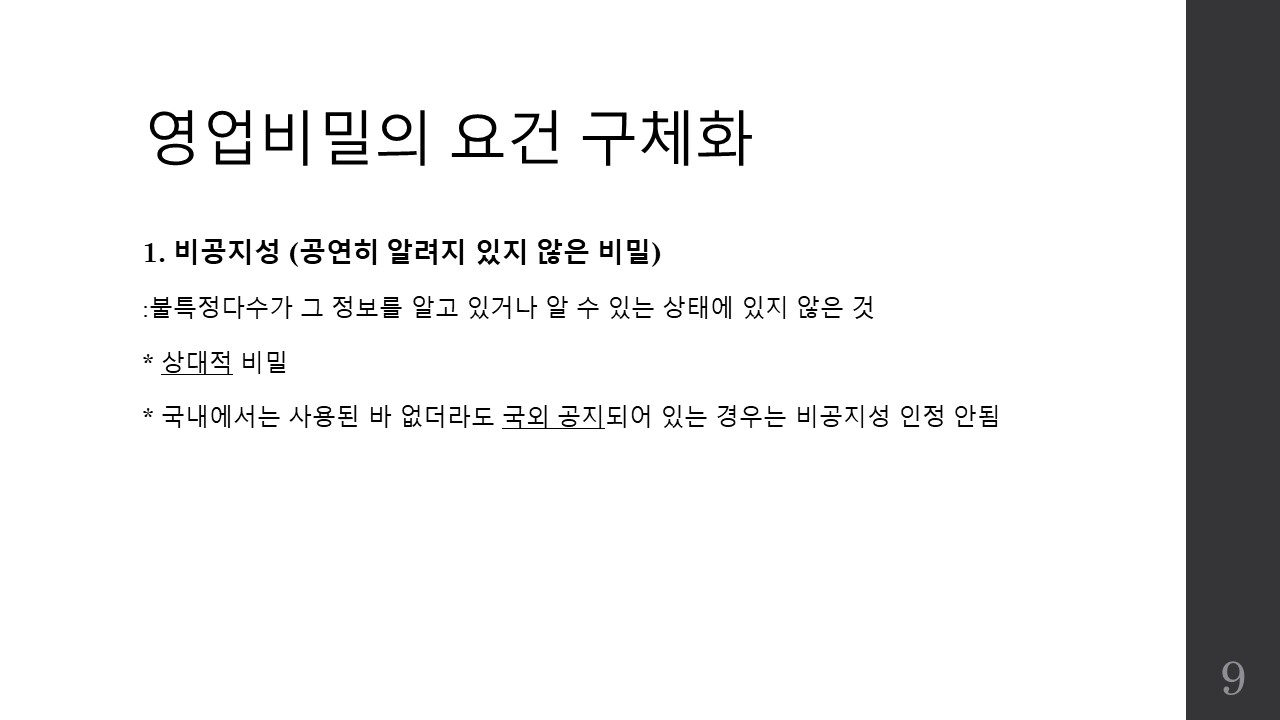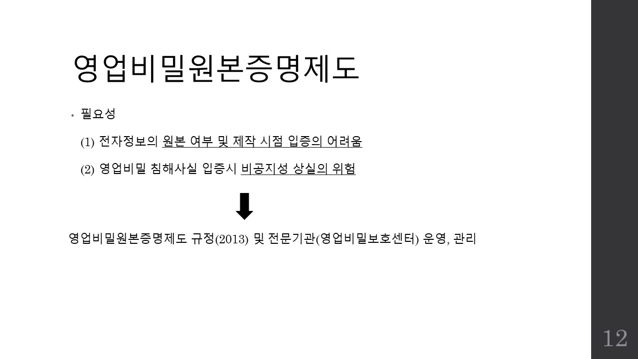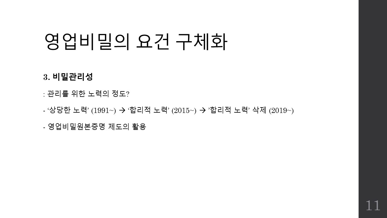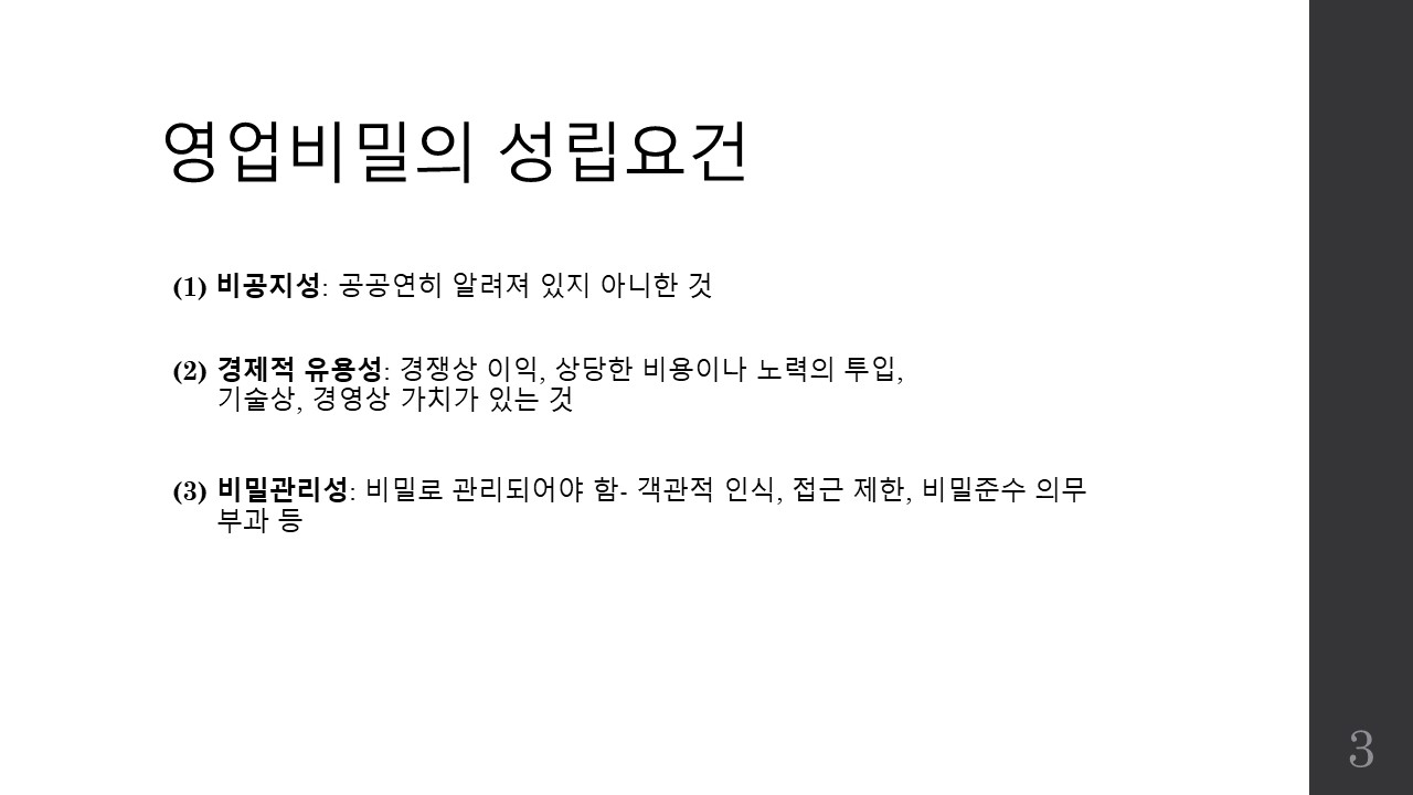 파워포인트 슬라이드로 영업비밀보호 제도의 개요와 관리방안, 그리고 침해시 구제책에 대한 간략한 소개자료를 만들어공유드리며 파일이 필요하신 분은 제 이메일로 요청해주시면 송부드리도록 하겠습니다.