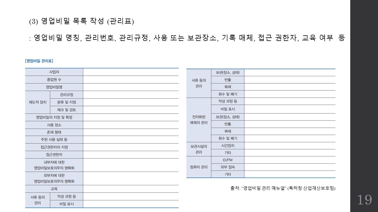 자료는 영업비밀보호센터와 특허청 산업재산보호팀에서 제공하는 "영업비밀관리 매뉴얼", "영업비밀보호 실무편", 그리고 “기술보호의 초석 영업비밀 보호제도"을 참고하여 정리하였으므로 더 상세한 사항은 해당 자료집을 통해 확인하시면 좋겠습니다.