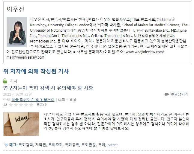 | [법률사무소 영문/중문/일문 기사] Careers outside academia: How her PhD helps Woojin Lee give legal advice to bioscience companies (1) | 2022.07.24 |