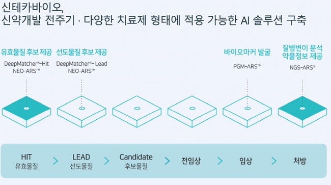 신테카바이오의 주요 AI플랫폼 기술은 구입 가능한 수억 단위의 화합물 라이브러리 검색을 통해 유효물질을 도출하는 딥매처(DeepMatcher)다. 딥매처는 유효물질 도출을 비롯해 최적화를 통한 선도물질 발굴, 2차 타깃과 오프 타깃 분석, 약물저항 바이오마커의 개발을 위한 플랫폼으로써 정확하고 효율적인 신약후보물질 발굴을 가능하게 한다는 설명이다. 딥매처는